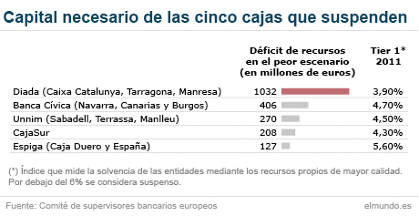 Han suspendido 5 cajas españolas, destacando la Diada (Caixa Cataluña, Tarragona y Manresa) que necesitarían más de 1.000 millones de euros en los escenarios más pesimistas.