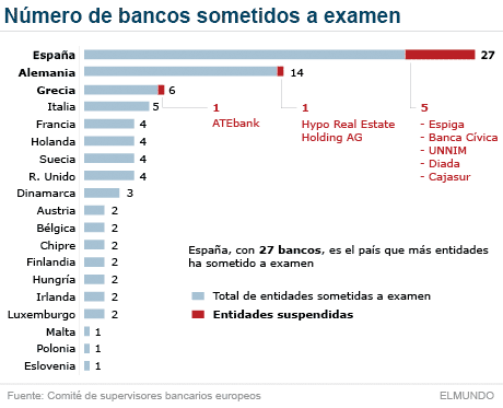 De entre todos los bancos y cajas que se han analizado, en total 91 repartidos entre 20 países, ha suspendido 7 entidades a nivel europeo, de las cuales, 5 son cajas españolas.