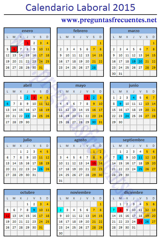 El calendario laboral para 2015 recoge un total de 8 fiestas nacionales comunes, cayendo todas entre semana salvo una.