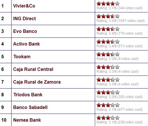 Lo curioso de este hecho, es que lo ha superado con bastantes votos. Cosa diferente sería que tuviera menos de 10 valoraciones, pero tiene 344. Cuenta con 3,7 estrellas de 5 posibles, 0,2 estrella más que ING Direct; es sí, ING le quintuplica en valoraciones (1.561).