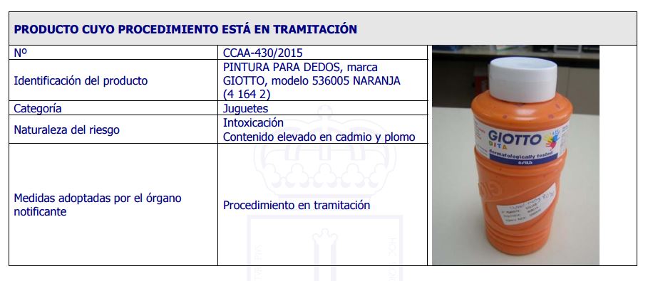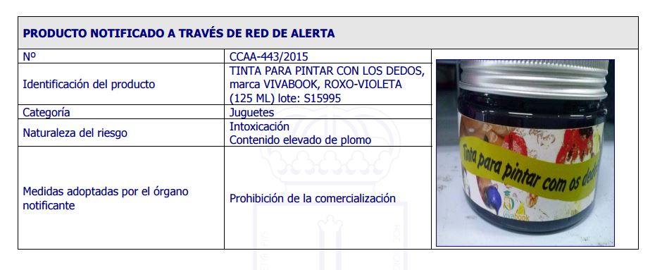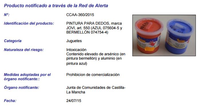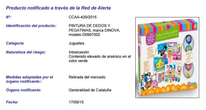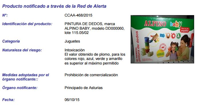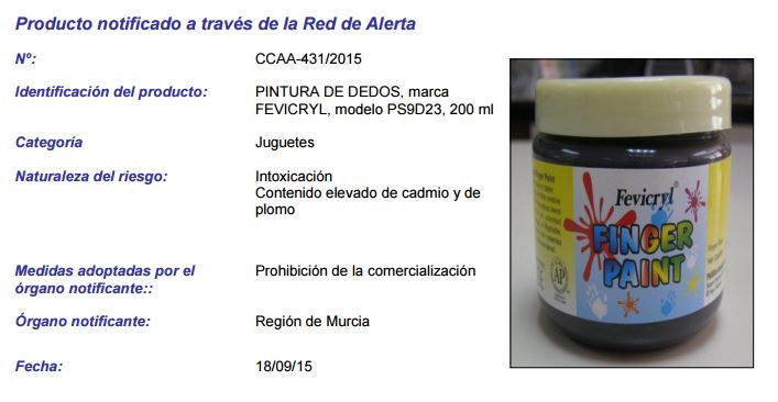 La alerta dada por la Agencia Española de Consumo (AECOSAN) y Consejería de Sanidad y junto con la Comisión Europea avisa sobre la toxicidad de varios tipos de pinturas para dedos en las que se ha detectado la presencia de metales pesados que podrían suponer un riesgo para la salud de los menores que habitualmente las utilizan.