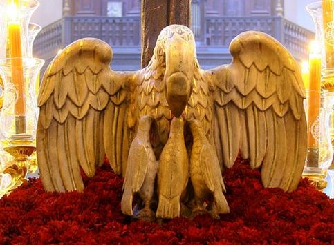 Dice la leyenda que un pelícano devolvió la vida a sus crías muertas con su sangre, esparciéndola sobre ellas tras abrirse el pecho a picotazos. Según se cuenta, el pelícano cuando no tiene comida para darle a sus crías se arranca a picotazos trozos de carne de su pecho para alimentarlos y evitar así una muerte segura. ¿Qué más muestra de amor que ésta?