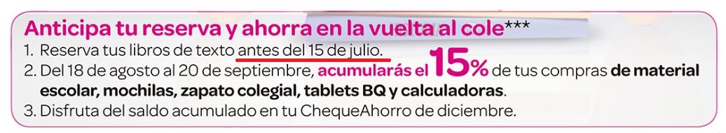 El descuento del 15% que aplican se acumula en todas las compras de material escolar (escritura y accesorios, material de oficina de papelería, manualidades, agendas, cuadernos y paquetes de papel), mochilas, zapatos, tablets, BQ y calculadoras, que realices del 18 de Agosto al 20 de Septiembre.