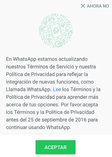 WhatsApp está empezando a distribuir a los usuarios de su aplicación, un mensaje de aviso en el que indican que para seguir usando el servicio tienes que aceptar los cambios.