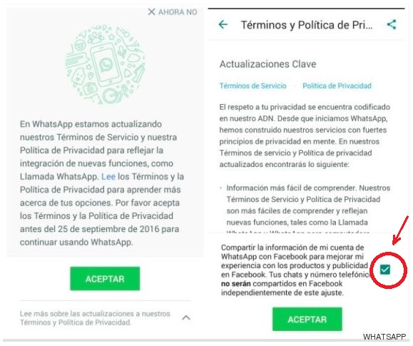 Antes de dar a Aceptar, da a una flechita que aparece debajo a la derecha de Aceptar y aparecerá un tick de compartir la información entre WhatsApp y Facebook.