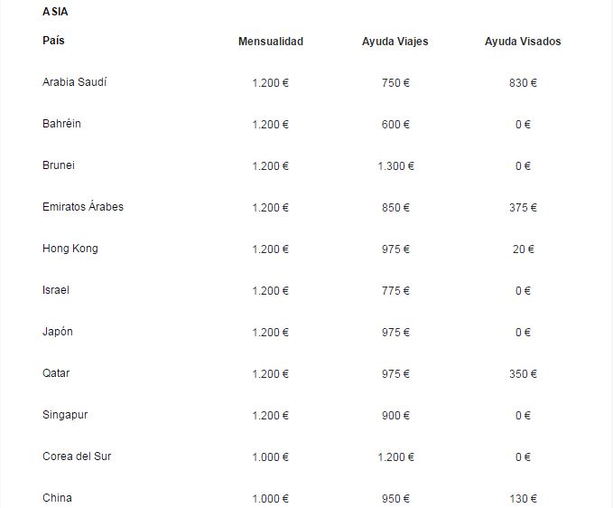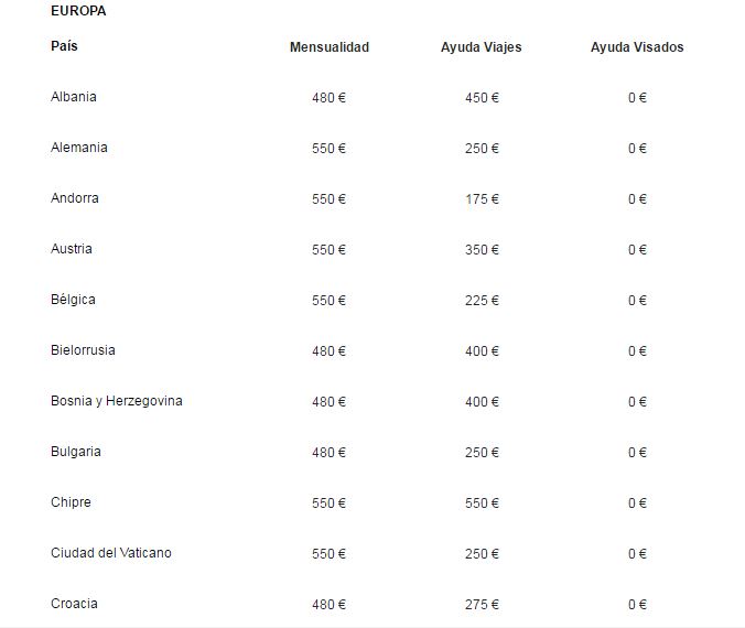Las Becas ARGO además de incluir el Seguro y la Seguridad social, incluye también una paga mensual, los visados, así como el pago del Viaje de ida y vuelta en las cuantías que puedes ver en el siguiente cuadro dependiendo de tu país de destino: