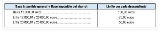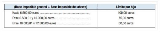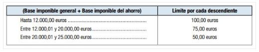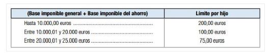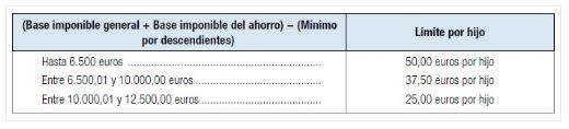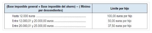 Además, la base imponible no podrá superar los 12.500€ en tributación individual ni los 25.000€ en conjunta y únicamente podrán tenerse en cuenta los gastos originados por los hijos que, a su vez, den derecho al mínimo por descendientes.