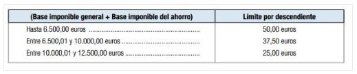 En el caso de las familias numerosas, el importe máximo de la deducción aumenta hasta los 150€ por hijo en declaración conjunta y los 75€ por descendiente en declaración individual.