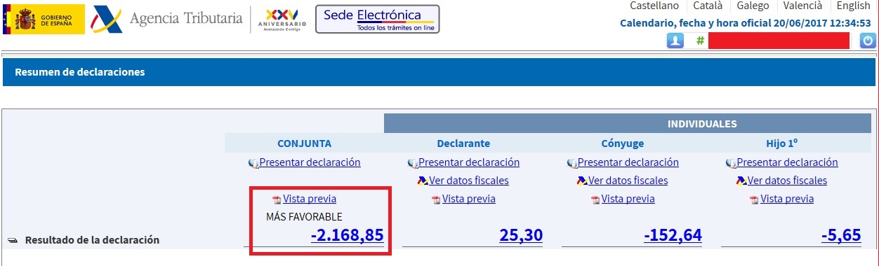 Una vez introducido los datos de todos los miembros, el programa te indica (en el resumen) qué modalidad es mejor, y de hecho puedes ver la diferencia entre presentar la declaración individual o conjunta.