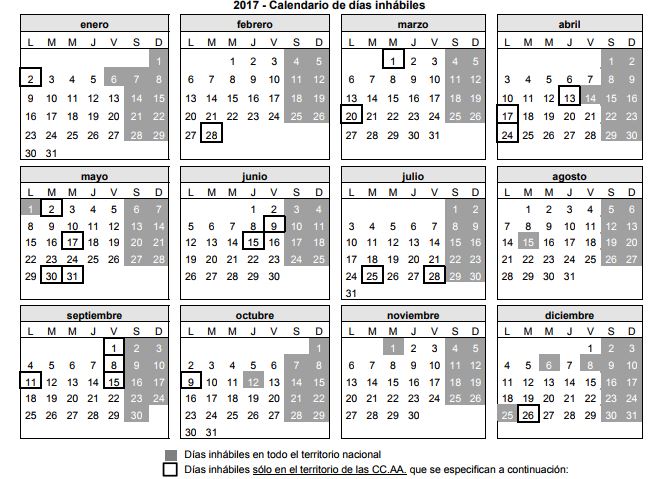 El calendario de días inhábiles según el Boletín Oficial del Estado para el año 2017, a efectos de cómputos de plazos para realizar trámites administrativos es el siguiente (BOE viernes 29 de noviembre de 2013):