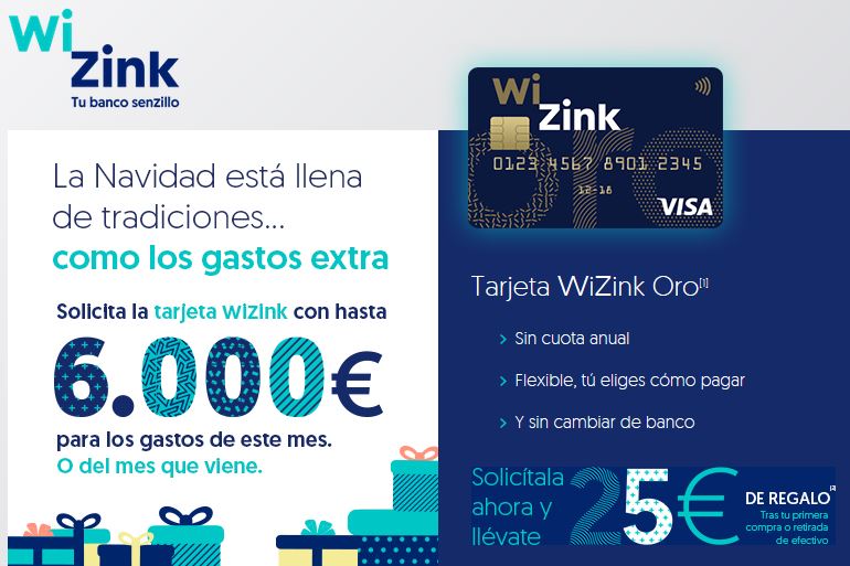 Wizink ofrece 25€ de bonificación a los nuevos clientes que contraten la tarjeta y realicen la primera compra o retirada de efectivo (transferencias a cuenta corriente no incluidas) con la tarjeta.