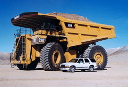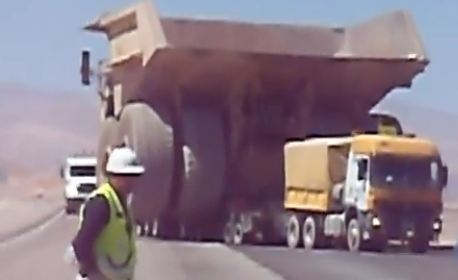 Ver cómo un camión transporta como carga un mismísimo Caterpillar 797 (camión de minería que carga hasta 363 toneladas, con velocidad máxima 67 km/h, peso 597 toneladas y depósito de combustible 3.790 litros) en el desierto de Chile, es algo impresionante.